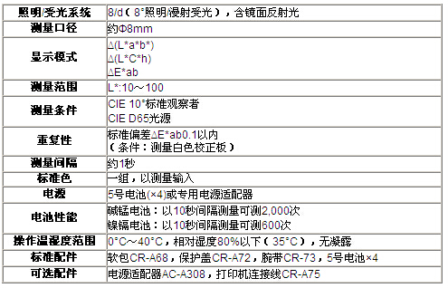 色度檢測(cè)儀CR-10是一種體積小巧、電池驅(qū)動(dòng)的色度檢測(cè)儀,適用于快速色彩控制。先測(cè)量目標(biāo),然后再測(cè)量樣品。一秒鐘后,液晶顯示屏上即會(huì)顯現(xiàn)色差值(以L*a*b*和dE*或L*C*H*和dE*表示)。該色差計(jì)采用8°方向照明擴(kuò)散受光方式,測(cè)量口徑為8mm,適用于各領(lǐng)域應(yīng)用。所有測(cè)量均在標(biāo)準(zhǔn)的D65光源和10°觀察條件下進(jìn)行。另外,CR-10可連接外部打印機(jī)將測(cè)量結(jié)果打印出來(lái)。